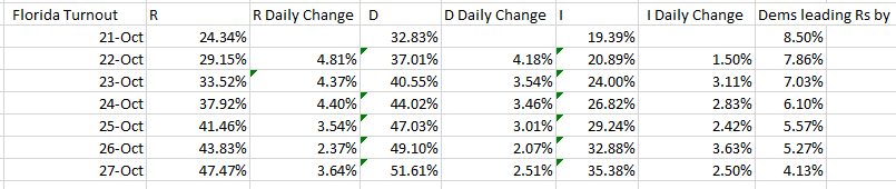 Also note that Republicans have been closing in on Dems everyday, in other words. Democrats had a huge jump from their die-hards mailing in ballots very early, but since that initial flood of votes, turnout is slowing while Republicans have been gaining day by day. Here is an example of turnout %s in Florida over the last week: