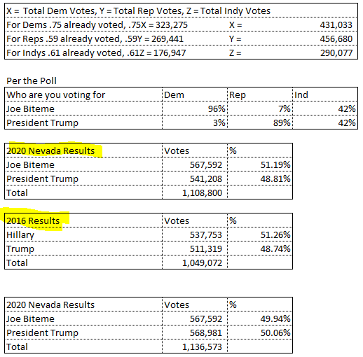 Back to Nevada and NYTs 6 point victory for Biden. Taking the already cast ballots / turnout (from official Nevada state data) and the %s of people who are still going to vote (from the poll) and the %s the parties will break for each candidate (per the poll), I get the following final vote tally, note that Trump, under these circumstance does a little better than he did against Hillary: